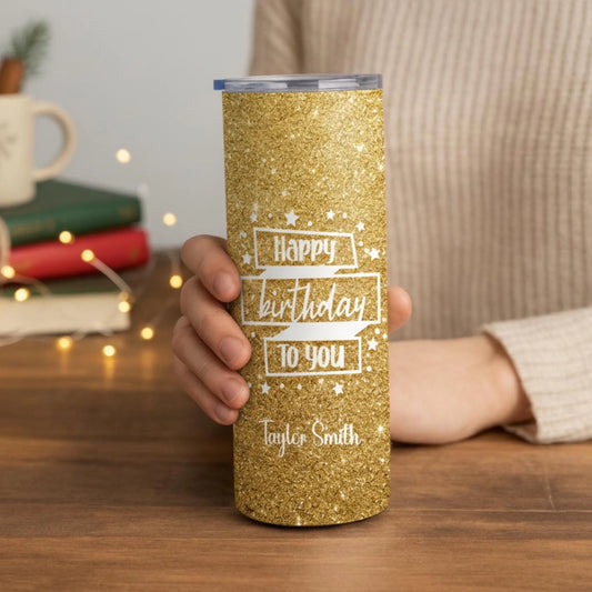 Glittery Birthday Tumbler - Custom Name in Gold & White